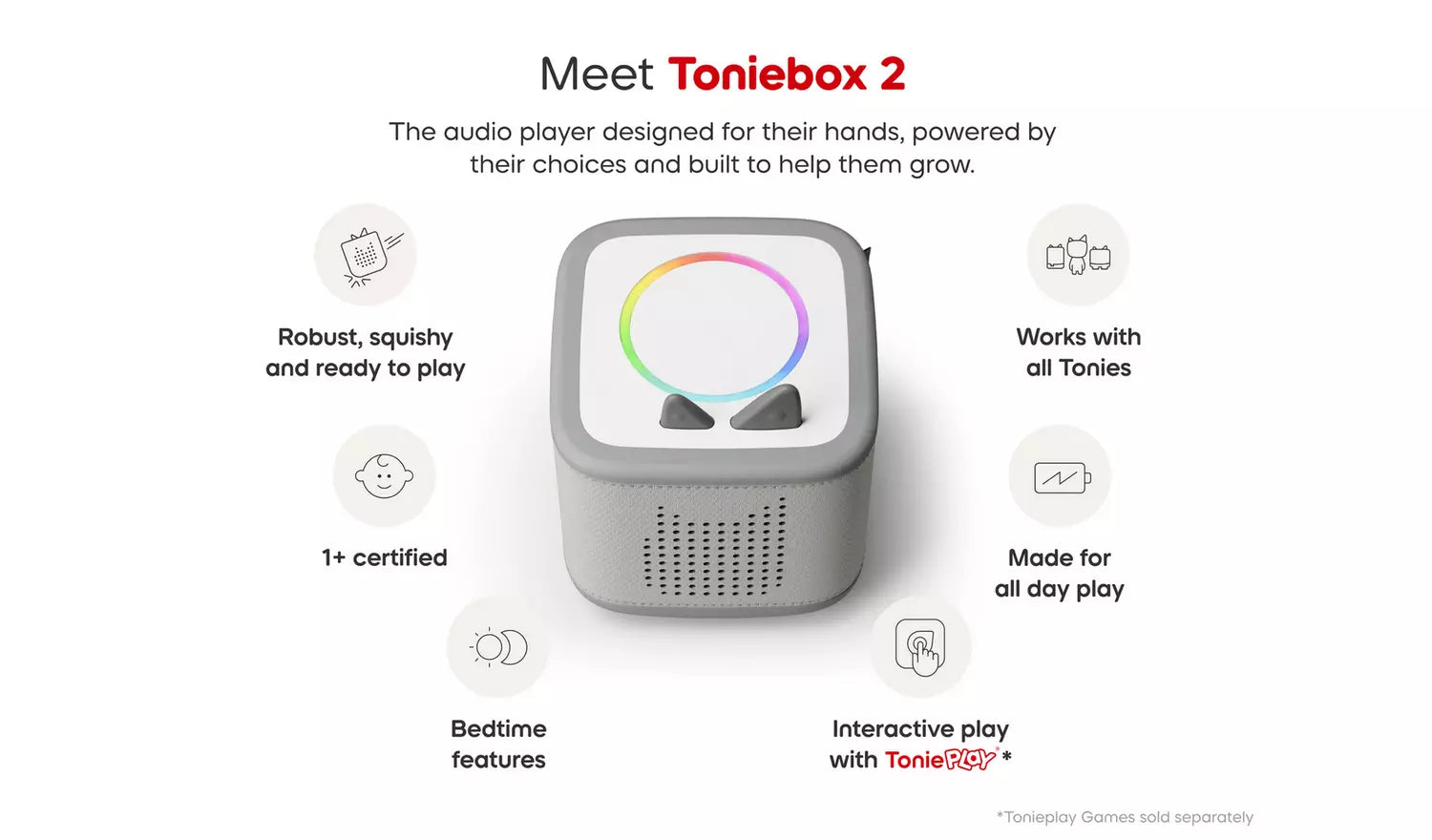 Toniebox 2 is the kid-powered audio player, made for ages 1-9+. No screens, no ads. Kids can dive into favourite stories and songs with an ever-growing crew of Tonie characters. Just pop one on the Toniebox and go! Or, unlock interactive games, quizzes, and challenges where they take the lead with Tonieplay. New bedtime features help them build better sleep habits. This Starter Set includes a Creative Tonie with space for up to 90 minutes of custom audio. Listen, play and grow in a whole new way.